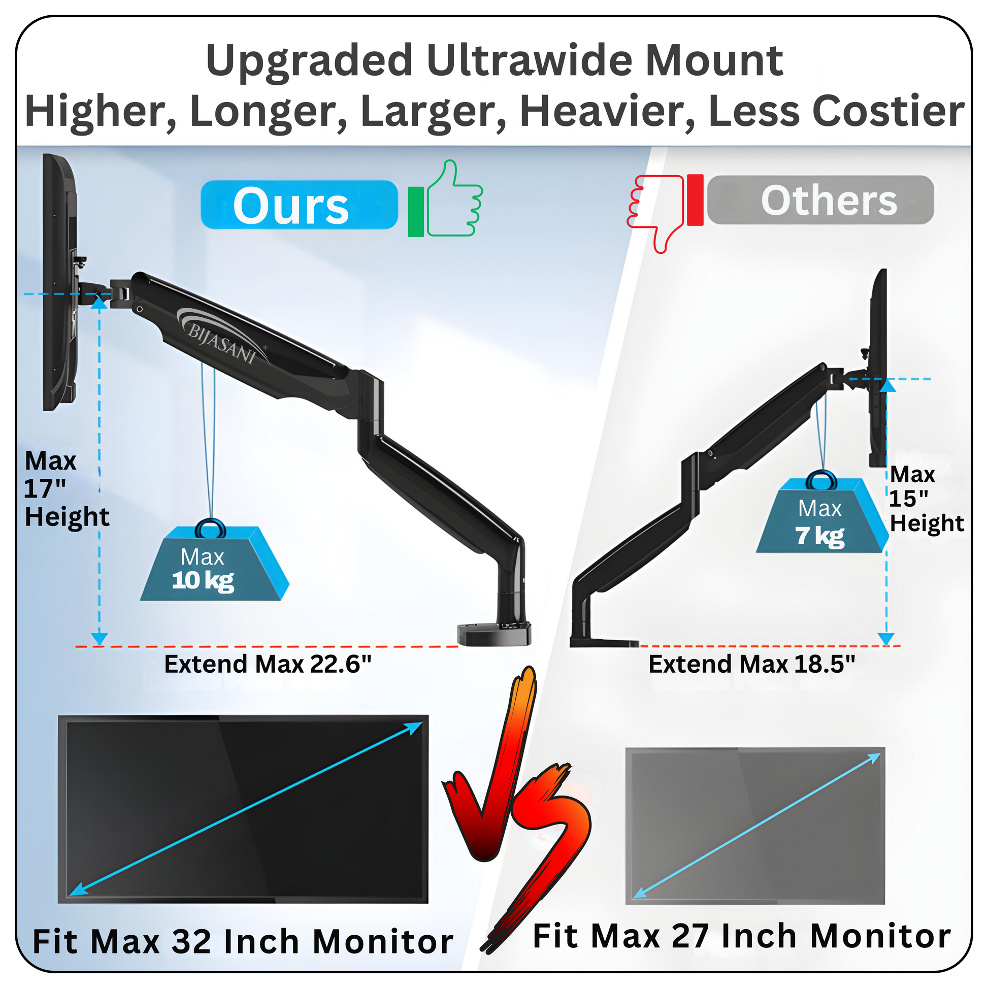 ✅ ASSURED HOLDING CAPACITY Weight-tested design holds monitors securely without sagging, unlike other arms claiming 9–10 kg capacity.